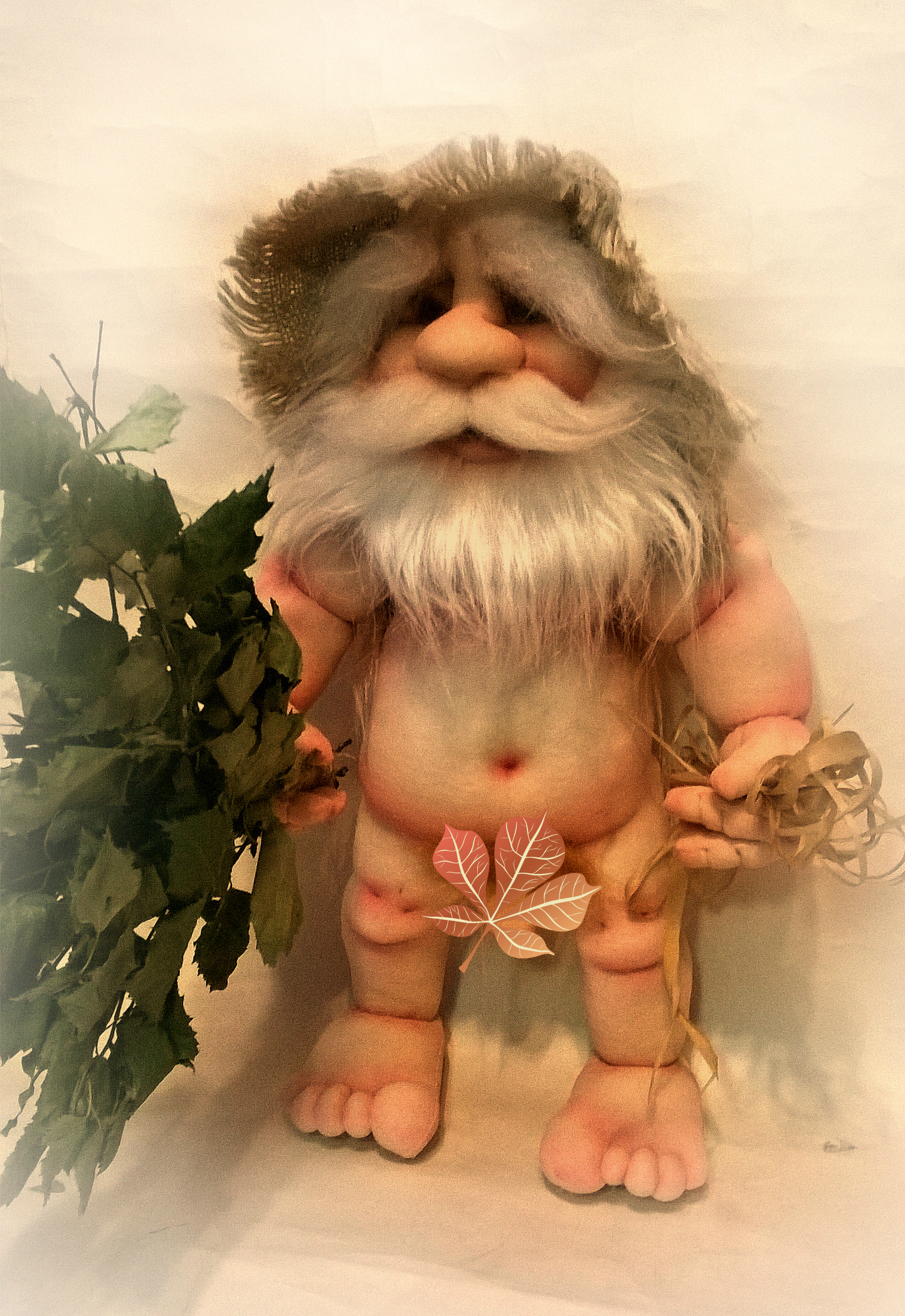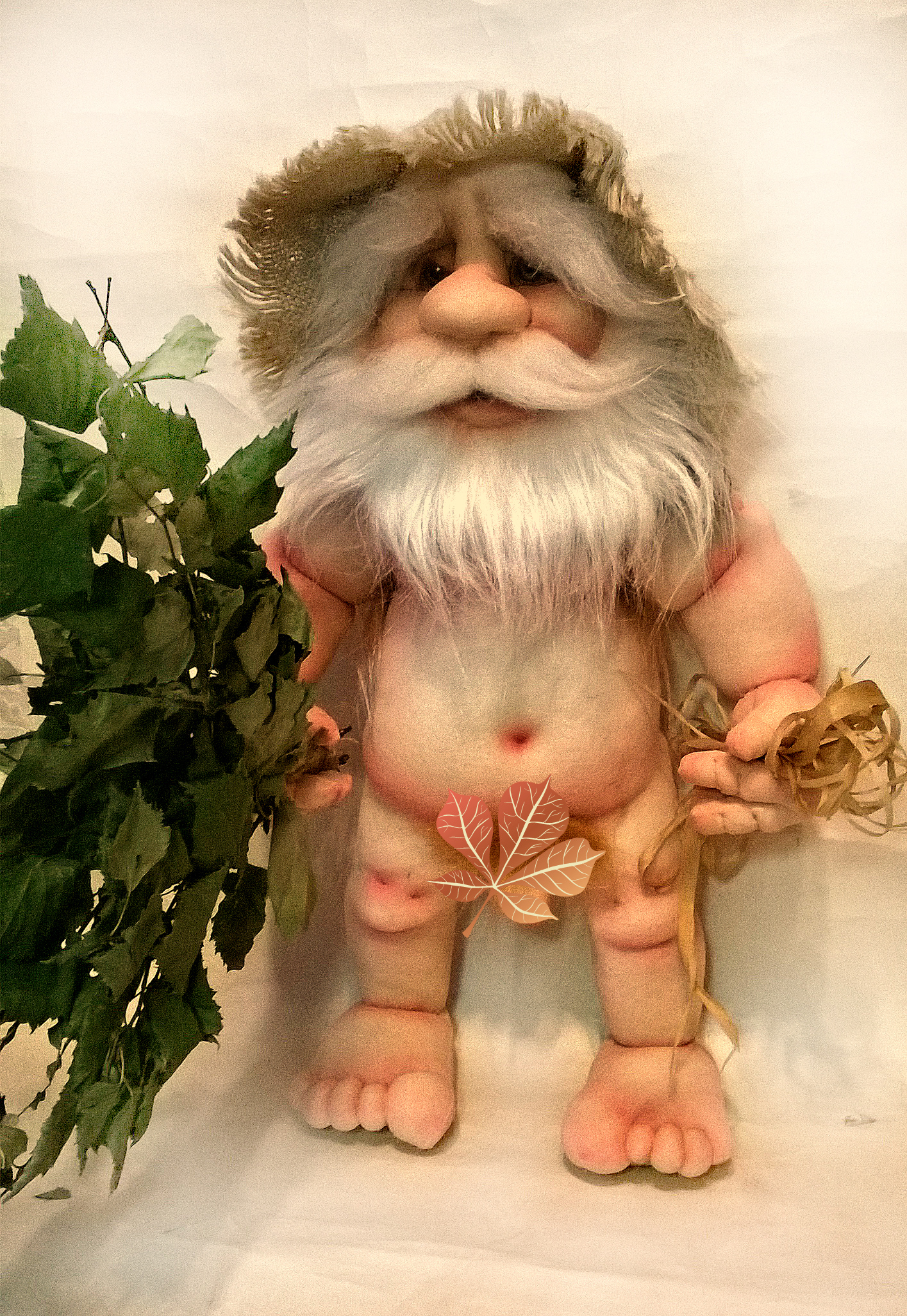 Банщик выполнен в технике скульптурный текстиль.Проволочный каркас позволяет менять положение рук и ног у куклы. Оберег для бани..