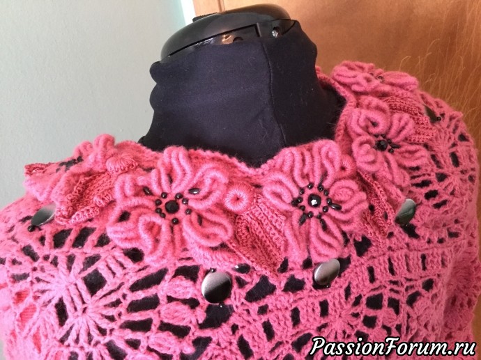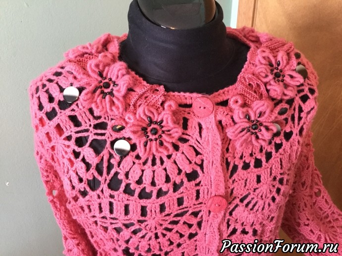 здравствуйте девочки.Хочу с вами поделиться моим результатом работы с рисунком подсмотренным на форуме на жилетке для девочки у одной нашей мастерицы.К сожалению я не сохранила ссылку ,только рисунок распечатала.Рисунок сразу понравился ,особенност здесь на тонкой нити получилось воздушно цветочное изделие.Немного к низу изменила рисунок увеличила количество кластеров в фрагменте рисунка,что бы получилось немного расклешенное к низу.Ниточки трех цветов малина,голубая бирюза и этот нежный немного старо розовый оттенок купила по случаю ,три бобины по 2 кг типа как на трикотажных фабриках используют на машинах .Вот пока применение только к одному цвету пришлось по душе.Вяжется очень быстро ,рисунок очень лёгкий и запоминается очень быстро.Наверное такой"халат"-так мой муж назвал мою работу ,можно и летом в прохладную погоду накинуть на плечики и не застегивать на пуговички..Спасибо за внимание !