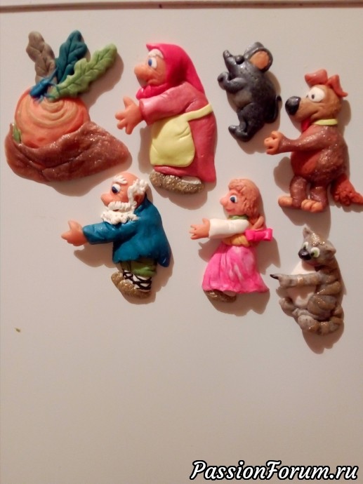 Подарили внучке на Новый год магнитный мольберт. И я имела неосторожность сказать мужу: "писать. считать, рисовать еще не умеет, а вот играть в сказку уже сможет" (внучке 1 год и 4 месяца). И вот результат. Слепились две сказки - "колобок" и "репка".