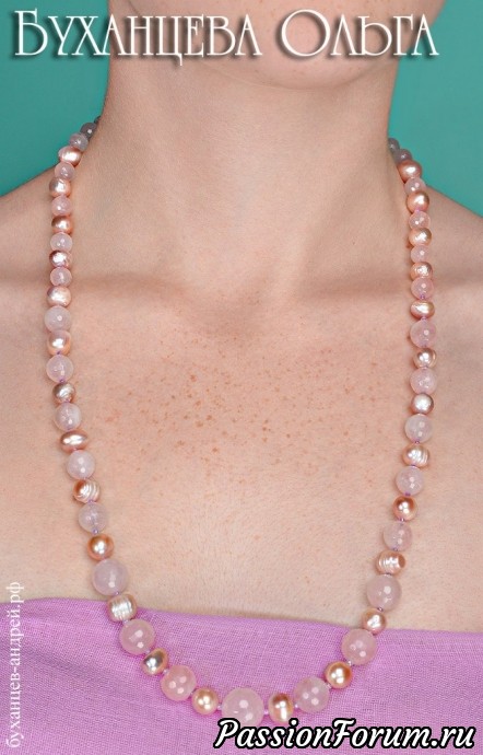 Жемчуг заслуживает отдельного разговора! Натуральный жемчуг розового и сиреневого цвета. Ориенд (сияющая оболочка жемчужин) не однородная, бочок сиреневый, а округлая часть сияющего золотистого, розового, переливающегося цветов. Ни до- ни после создания этих двух ниток такого материала у меня в руках не бывало.