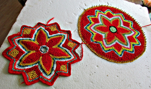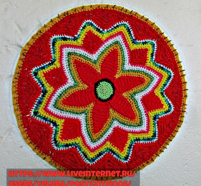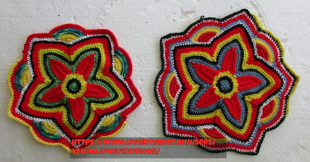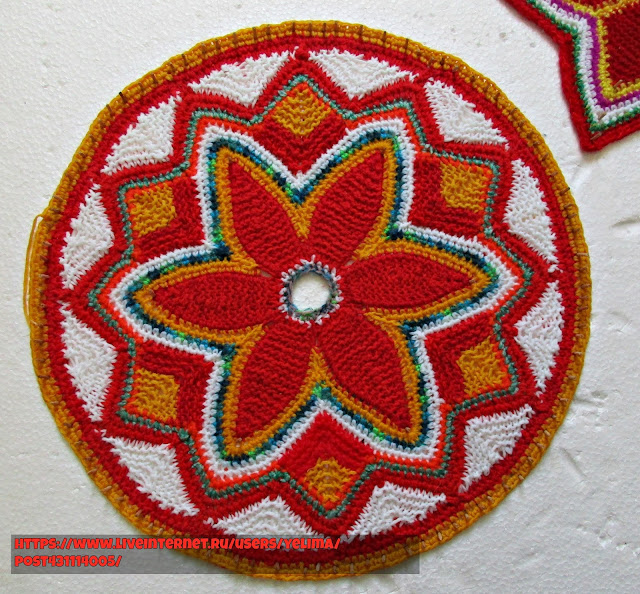 Узоры я сделаю все разные, не люблю в точности потвторяться даже дважды, а тут аж 5 раз!Заполняю звенья мандала, и крючком и спицами; где как удобнее. Контуры уплотняю крючком, чтоб форма лучше,жёстче держалась, а там, где должно лучше растягиваться и амортизировать(заполнение углов)-там на помощь приходят спицы. Ведь спицевое полотно более растяжимо, чем крючковое.