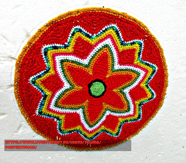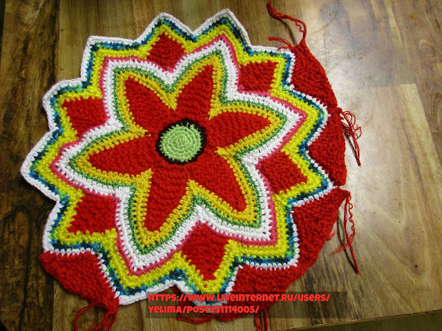 Попробовав нарастить прихватку в диаметре, я поняла, что где-то немного стянула лишнего; так как круг даже после натяжки,стал пузыриться ''горбом''.