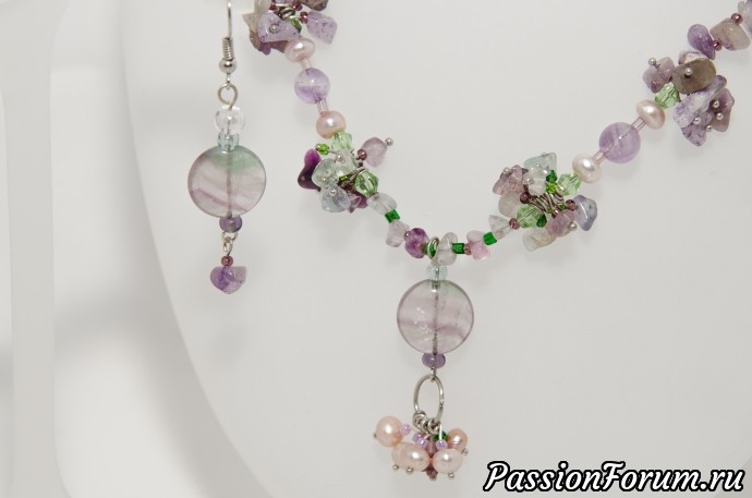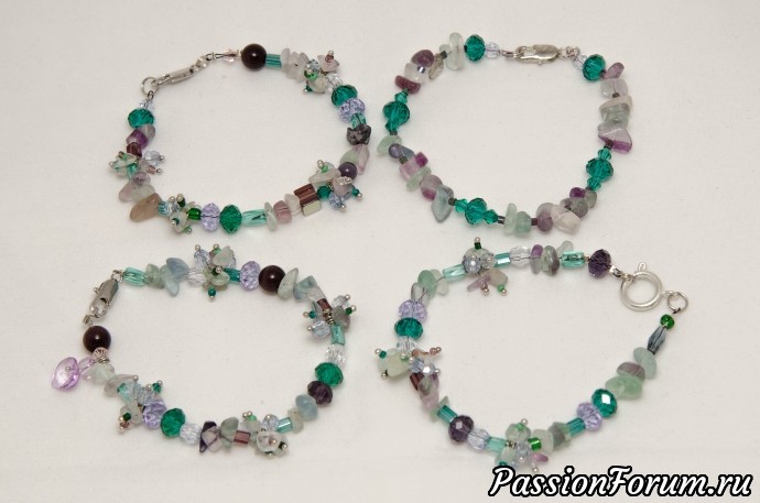 Сочетания светлых или ярких фиолетовых минералов должны быть такими, чтобы вызывать позитив. Поэтому часто, например, аметисты, «разбавляют» минералами и элементами, вносящими сияние и оптимизм даже при мимолётном взгляде. Отсюда так часто используются комбинации фиолетового с белым и серебристым. Фиолетового с сиреневым и желтоватым. Тут компонуются и мутные с прозрачными, и насыщенные с бледными цветами и оттенками. Используется приём стимулирования и умиротворения поочерёдно, чтобы иметь благоприятное воздействие на здоровье и психику. Фиолетовый с зелёным можно назвать наиболее гармоничным сочетанием (на уровне чакр это связь теменной и сердечной).