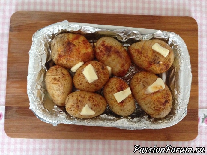 За пять минут до окончания, вынуть из духовки картошку. Сверху положить маленькие кусочки сливочного масла! И снова в духовку).