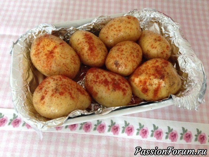 Но лучше окунуть, чтобы в прорези масло попало. Посолить. Поперчить. Хорошо смазать каждую картошку). Уложить в посуду для запекания. Сверху посыпать сладкой паприкой, для красоты! Запекать в духовке 20-25 минут.