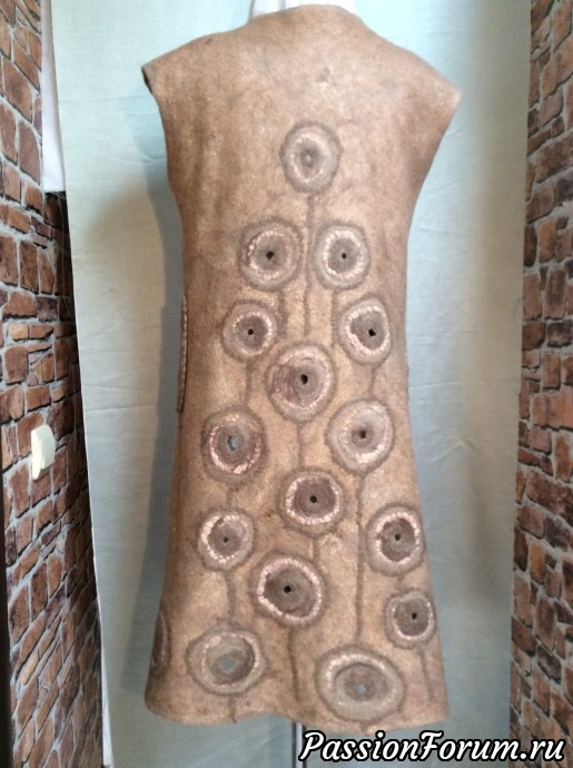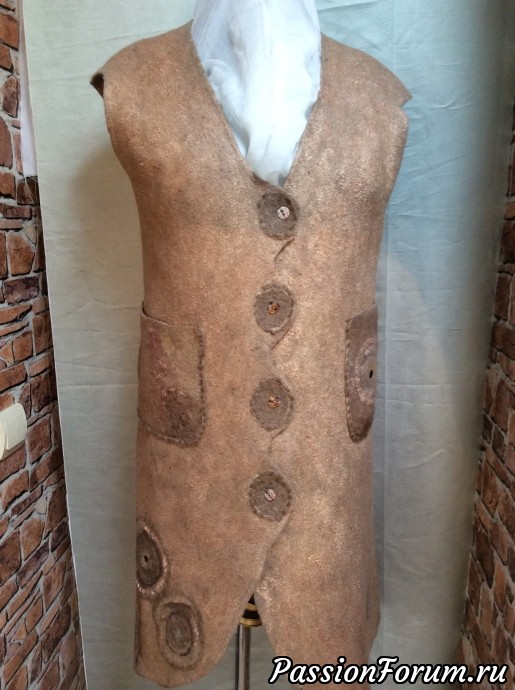 Оля, очень интересный жилет-пальто, очень спокойный цвет, интересная фактура, все продумано до мелочей, молодец! А одуванчики выложены из пряжи и префельта по центру потемнее, не совсем поняла на фото?