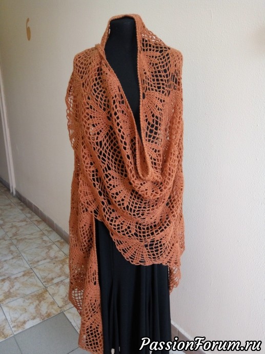 Рисунок не знаю как называется. Пряжа шерсть 90%, 10% синтетика, производство Рассказово, Тамбовская обл. Длина верхней планки 290 см. Длина по центру вниз 140 см. Вес 290гр. Крючок 4 мм. Немного переборщила с длиной. Надо бы чуть покороче. Эта шаль на рост от 160 см и выше