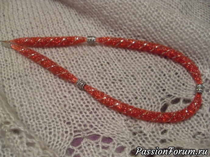 Ирина, Очень оригинальные бусики, спасибо за представление новой технологии, видела такие бусы раньше, в сетке были большие бусины, смотрелось попрясающе. Этот способ для меня, дело в том, что накупила бисера, а связать жгут не могу, у меня слабое зрение, не вижу мелких бисеринок, а вот насыпушки это другое дело. Подскажите как правильно называется сеточка, какого размера ячеек надо покупать и какие замочки используются для крепления. Заранее спасибо.