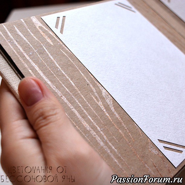 На крафт-страничках расположены только подложки для фотографий, небольшой декор состоящий из узора коры дерева и брызги краски.