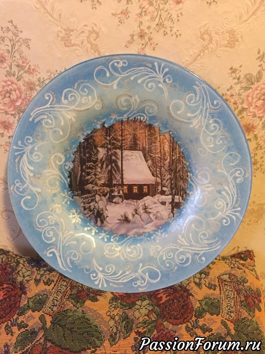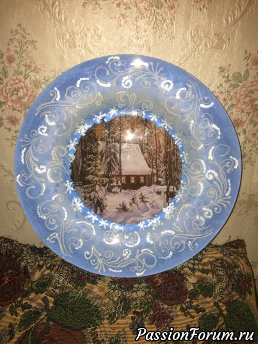 Тарелочку сделала по заказу двоюродной сестрички. Захотелось ей "Зимний лес с избушкой".