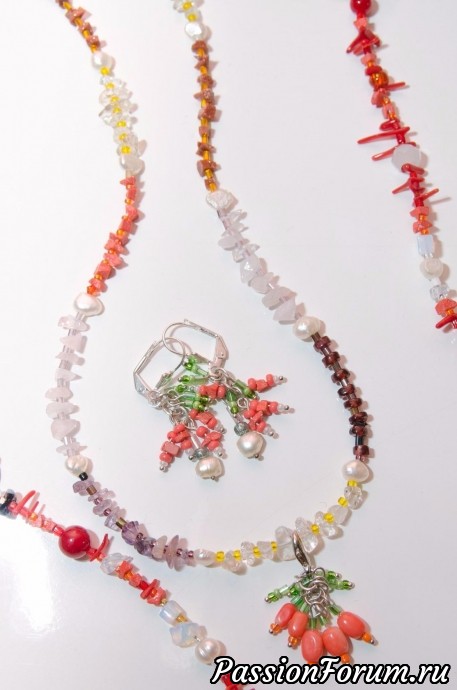 Материалы: коралл натуральный морковного цвета, натуральный жемчуг, мелкое стекло ручной полировки.
