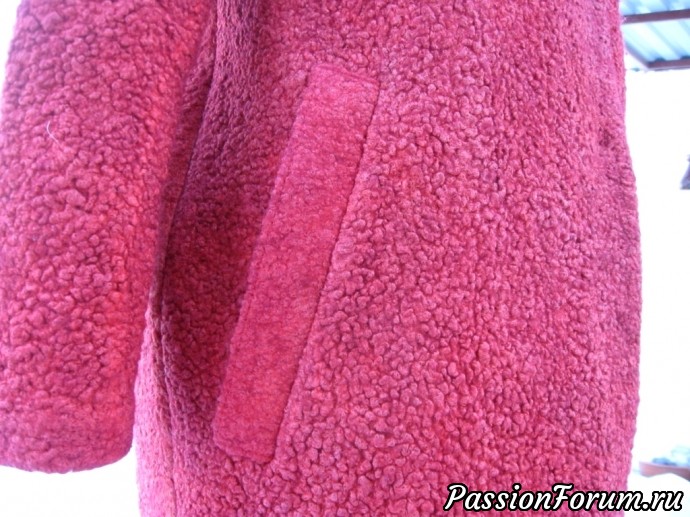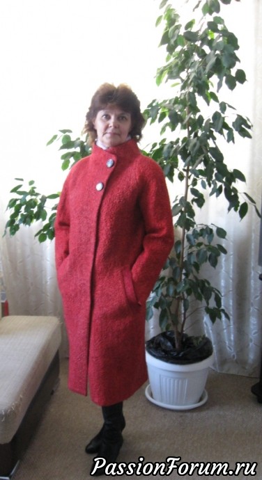 Добрый день, дорогие форумчанки! Давно не заглядывала на форум, трудилась! И вот хочу вам показать результат своего труда - пальто в технике "Шёлковый каракуль", как у Кати Коршун! Сразу оговорюсь, МК Катиного у меня не было. Попробовала свалять образец из троицкой пастилы Супервош и итальянского мериноса. Фактура понравилась. Решила рискнуть свалять и пальто! Валяла отдельными деталями, как и сама Катя рекомендует, потом сшивала. Мужу и родным пальто понравилось, это радует!