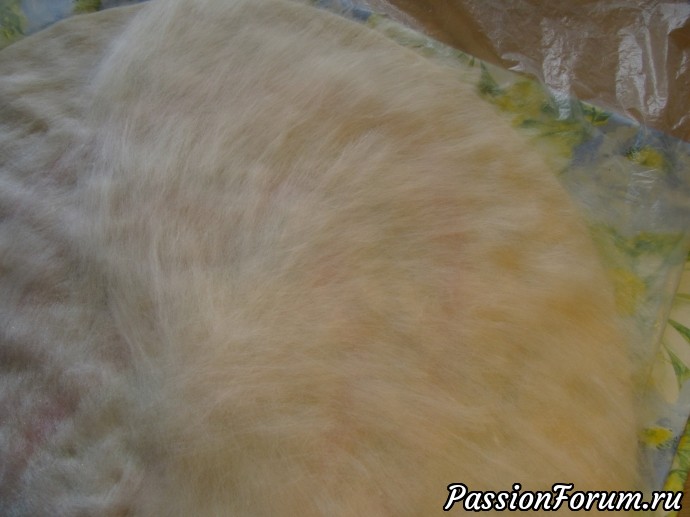 И дальше раскладка слоев по принципу-чуть смещая относительно 1 слоя пряди,но придерживаясь рисунка,т к помню- "поля" надо раскрыть,за полями- стянуть,и к окружности- привычная моя раскладка. Смотрю внимательно места соединения направлений,кладу там прядки,если надо,если где то просвечивает.