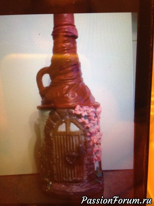 Решила сделать вот такой домик к весне с цветущим абрикосом,ух очень хочется ярких красок.К,сожалению,нет вида сзади,снимки не получились,а бутылку уже подарила.
