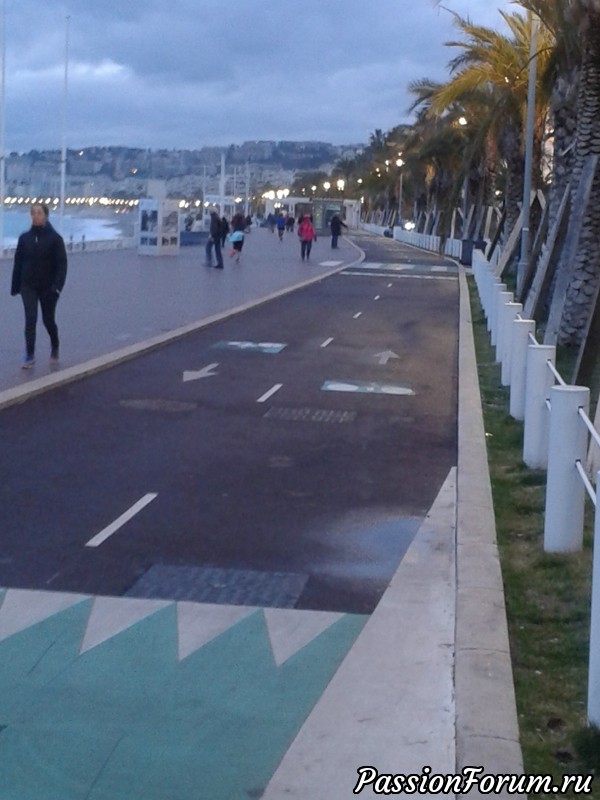 В Ницце развито передвижение на велосипедах, вот велодорожка идет и по набережной, переходить ее надо осторожно, бывает, что весьма быстро едет велосипедист