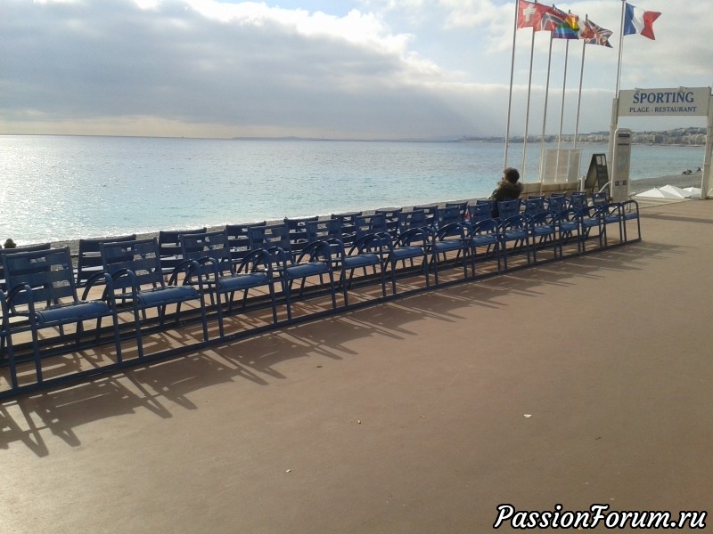 Английская набережная была построена англичанами (вот откуда ее название) еще в Х!Х веке. Конечно, сильно изменилась, что мы смогли увидеть, сходив на выставку фотографий в музей Массена. Длина ее около 7 км. Там всегда народ, особенно в выходные. Отличительный признак набережной - синие стулья. Они появились еще в 50-ые годы, их пытались убрать, но общественность возмутилась. Это уже третий вариант.