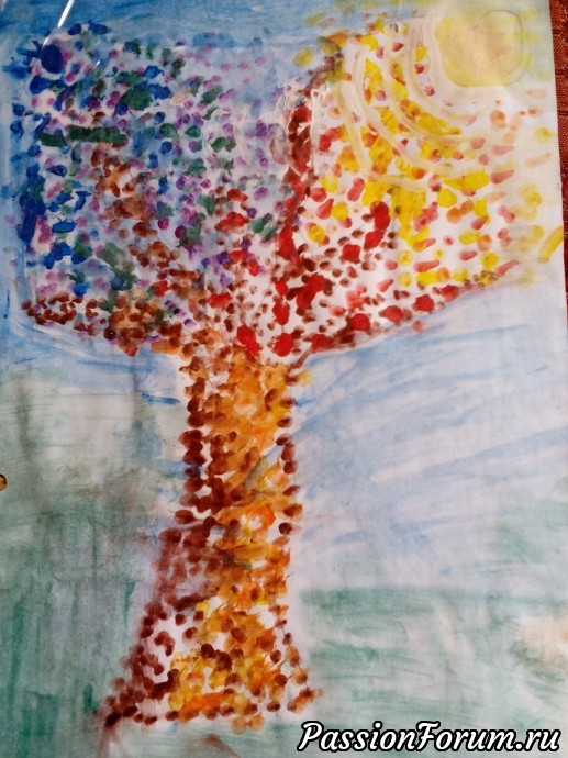 На этот раз мы с дочкой действительно смотрели известную телепередачу с одноимённым названием. И там фея Фиалка рассказывала о направлении в живописи, которое называется пуантилизм. Рисовали дерево в такой технике и мы с дочкой. А также нарисовали вдвоём рисунок подводного мира.