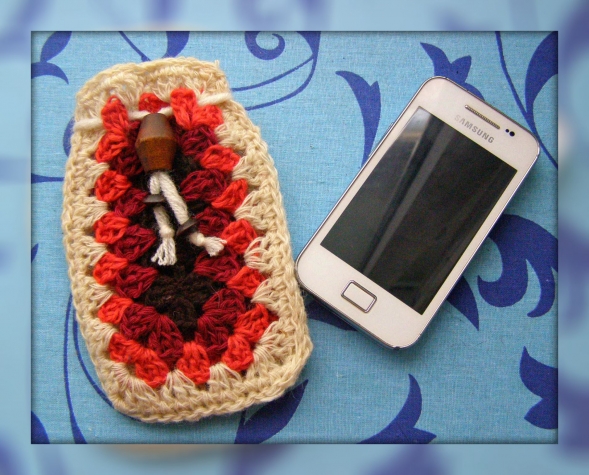 Крутила я ее, вертела, в итоге родилась вот такая сумка-мешок в этническом стиле, а из остатков - чехол для мобильного в комплект) Декор тоже натуральный - деревянные бусы) За основу взяла квадратные мотивы "бабушкин квадрат по-испански". Что скажете?