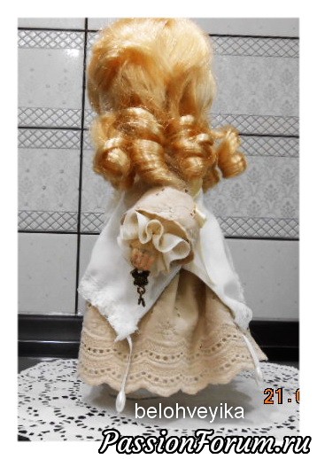 Ткань понравилась, дали мне полную свободу в выборе одежды. Сшила всё в сиреневых тонах- колготки, штанишки, 2 нижние юбки. платье. Послала фото, всё понравилось. Вот так рождается образ куклы. Меняется цвет волос, прикладываются разные кружева, цветочки. Иногда что то добавляется через несколько дней. Я ставлю куклу напротив себя и несколько дней смотрю на неё, вдруг ещё какая идея придёт.