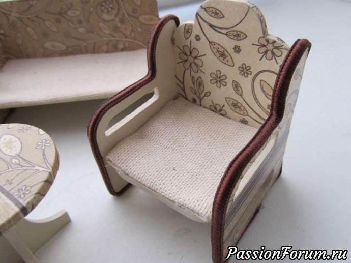 Комплект для отдыха декорирован моей любимой салфеточкой, по периметру спинок - сутаж. Сидушечки сделаны из клейкой ленты для утепления окон и двунитки.