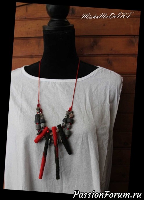 Колье выполнено из итальянского мериноса, полимерной глины, окрашенной вручную, крупного бисера. На тонком кожаном шнуре.
