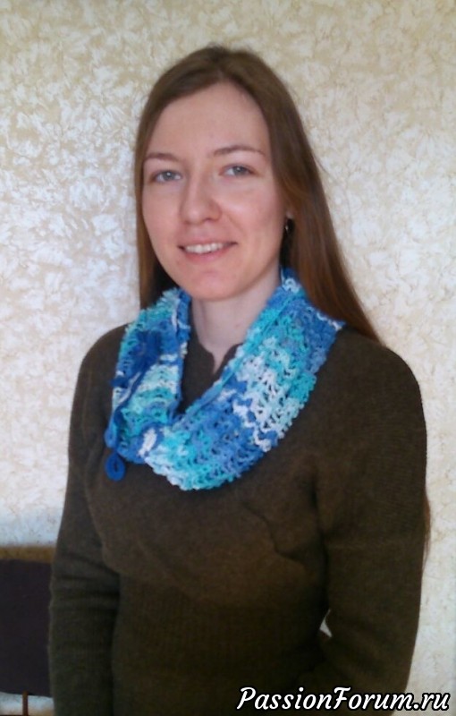 Когда младший сын привел к нам в гости свою будущую невесту, то я и ей похвалилась снудом для Лены. А потом пришла в голову мысль, а вдруг и ей захочется такой?!.... И не ошиблась! Но ей захотелось только снуд для весны. Опять хомяк послал нас в закрома! Поискали, посмотрели, что у меня есть, и я вспомнила про свой недовязанный из-за нехватки ниток микрофибры летний шарф. Вязала его по топику с нашего форума 2015 года. В описании требовался только 1 клубок ниток. Но его у меня хватило только на 1 метр шарфа (вяжу крючком редко, видимо туго вязала). Второй клубок нашла только через год в другом городе. Так мой долгострой и лежал, ждал своего часа. И дождался!....