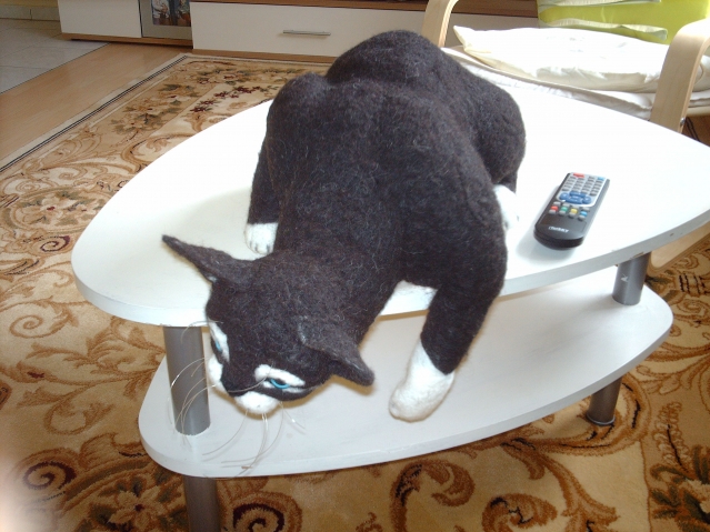 Котик Тимоша сделан методом сухого валяния из шерсти.