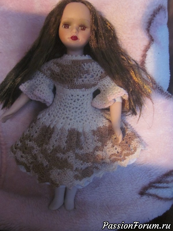 Спасибо.Волосы я делала сама.Впервые.Прическу периодически меняю.Платье вязала по МК.Тоже впервые.Но пришлось придумать воротник и рукава. А нижнюю юбку сама придумала.