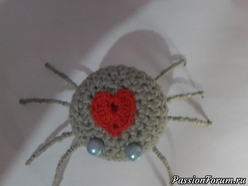 Тельце паучка связано из акриловой пряжи крючком, лапки из шпилек для волос, оплетенных нитью. Глазки - бусинки, внутри мешочек из фатина, наполненный лавандой.