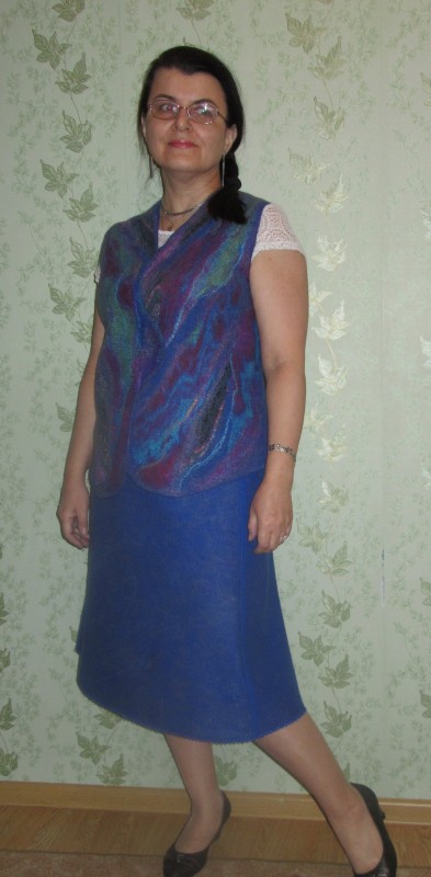 Здравствуйте, дорогие девочки! Каждый день забегаю на форум, и что то мало новых работ от вас, дорогие валяльщицы! Лето? Отпуска? Жду с нетерпением каждого топика. А сегодня, как и обещала- показываю вам свою новую жилеточку к юбке " синий квадрат", которую недавно сваляла. Как всегда, фотографии на себе нет (утро, одна) , коты помогать отказались- не царское это дело! А показать то хочется! Не терпится! Вот, смотрите.