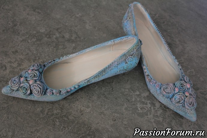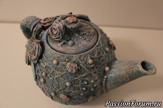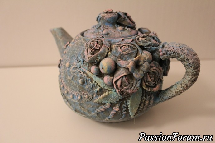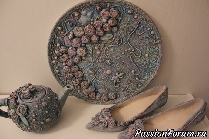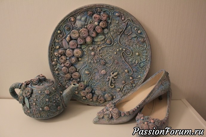 Посмотрела мастер класс Кристины Деменской как она задекорировала чайник и мне так понравилась эта работа, что и я сделала себе такой чайник, потом туфли и тарелку в этой технике!