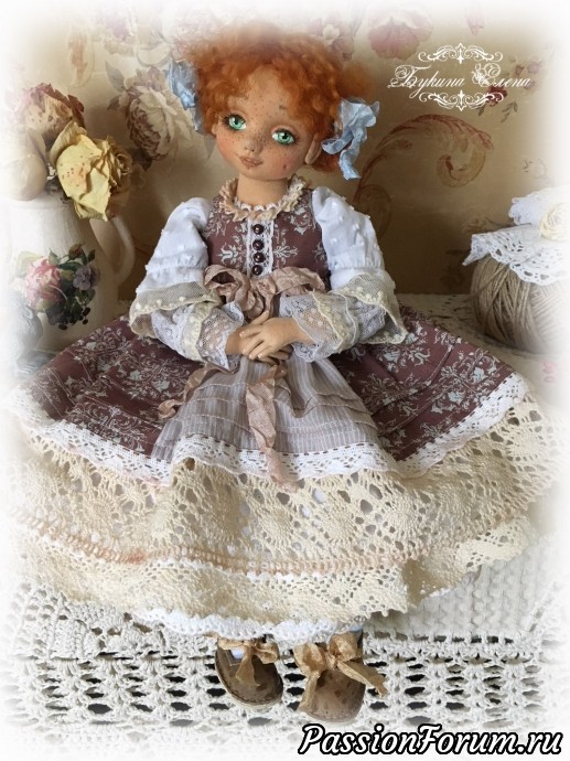 Знакомьтесь, Сонечка. Коллекционная полностью текстильная куколка. Малышка сшита из хлопка, обтянута трикотажем. Личико у куколки объёмное. Соня вся подвижная. Головушка крутится и наклоняется. Ручки и ножки крепятся, как у будуарных кукол или куклы-болтушки. Сонечка стоять не хочет, зато она умеет красиво сидеть и мило складывать ручки. Пальчики на ручках гнутся, есть маникюр. Волосы натуральные овечьи кудри, можно аккуратно менять прическу. У малышки вся одежда съёмная, кроме комбинезона. Одежка сшита из хлопка, батиста, украшена винтажным кружевом , шебби лентами. Ботиночки сшиты из натуральной кожи… В руках у малышки корзинка с фруктами. Рост куколки 39 см.