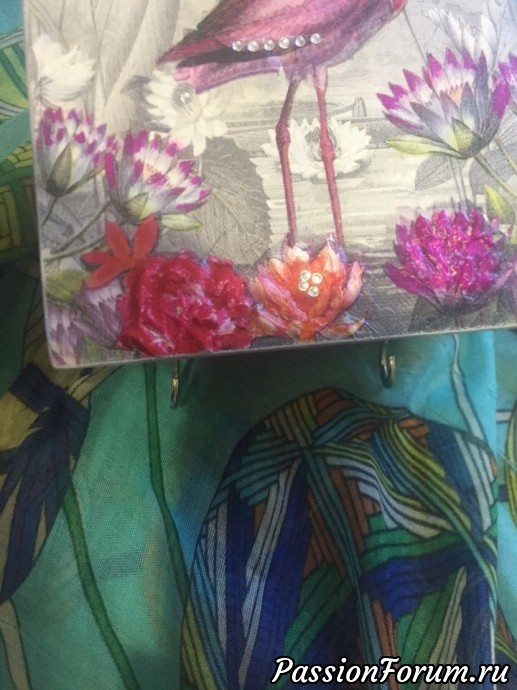 Интересный предмет получился, это вешалка, судя по крючкам?, внутри карман, да? Стразы, мне кажется, ни к чему, росу не напоминают, а работу удешевляют, трафарет на боковинах можно выделить, чтобы поярче стал, а боковинки выкрасить в основной тон салфетки, на фото они смотрятся чисто белыми
