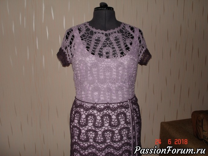 Доброго всем вечера! Сегодня закончила льняное платье. Несмотря на то, что брюгге не кажется мне сложным вязанием, это платье почему-то тяжело мне далось. Не очень люблю комбинированные вещи, но пряжи каждого цвета было недостаточно для полноценного изделия, поэтому пришлось изощряться. Вязала ленты, для расширения постепенно добавляя ряды в фестонах. Соединяла между собой уже готовые ленты, хотя нормальные люди соединяют ленты в процессе вязания. Потом были мытарства с чехлами. Первоначально сшила чехол из светло-сиреневого тонкого атласа. Не понравилось. Сегодня срочно побежала искать подкладочную ткань темно-сливового цвета. Удалось найти только шифон. В шитье эта ткань ведет себя очень нехорошо, но я его-таки домучила. С темным чехлом мне понравилось больше, но вот теперь думаю, что нужно бы сделать его подлиннее.