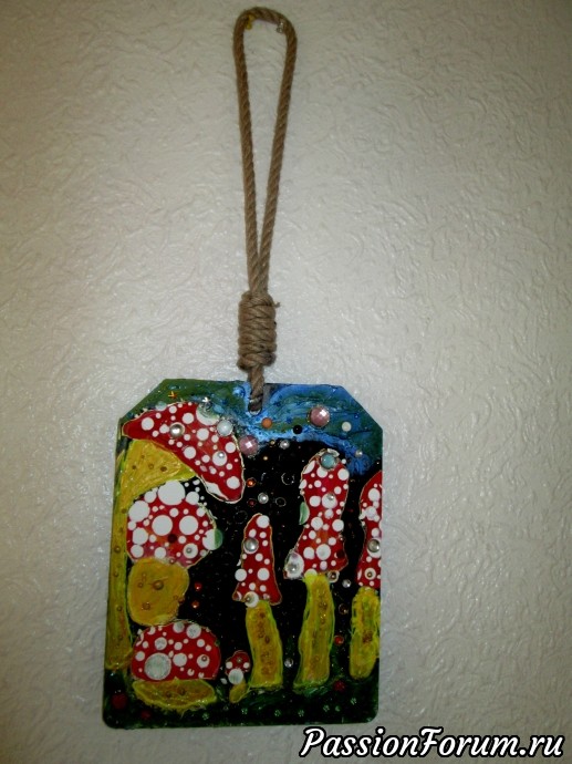 Отлично получилось! Всего хватает на мой взгляд: яркое панно, разноцветное, но гармоничное, декора достаточно вполне, хороша веревка-подвес, в противовес шарикам-бусинкам брутальности добавляет! На кухне надо повесить: кааак на мухоморы взглянешь — есть уже не хочется ))))