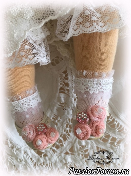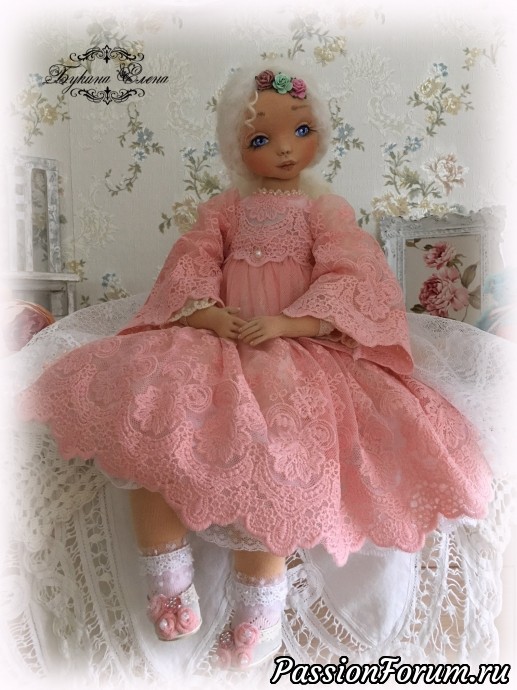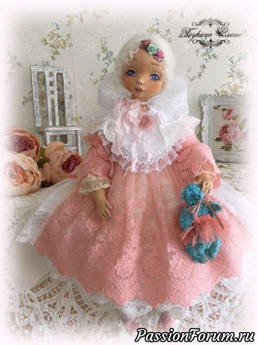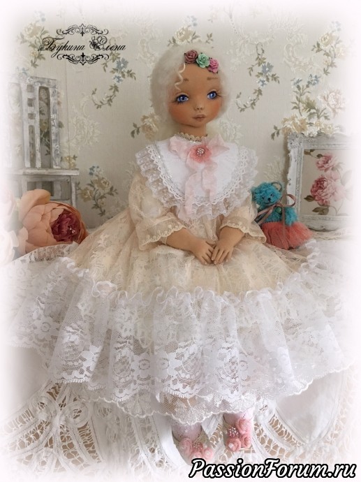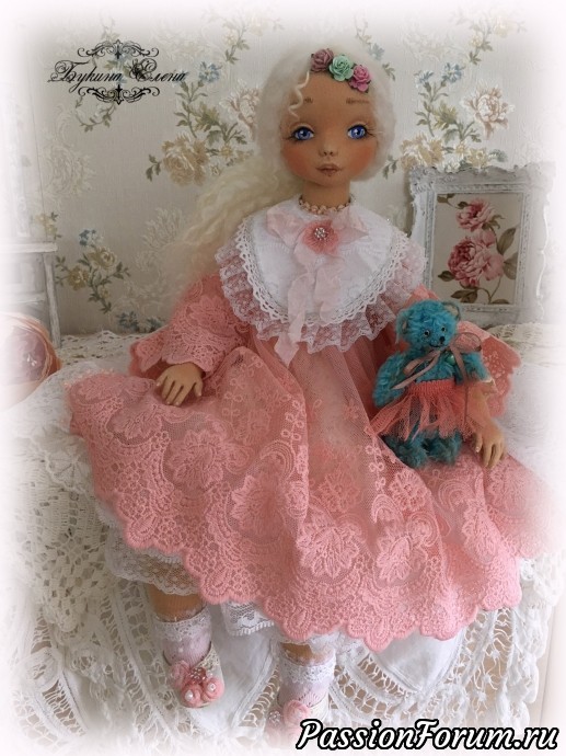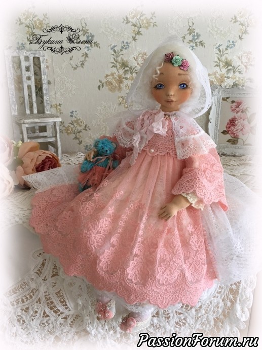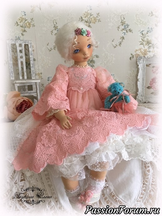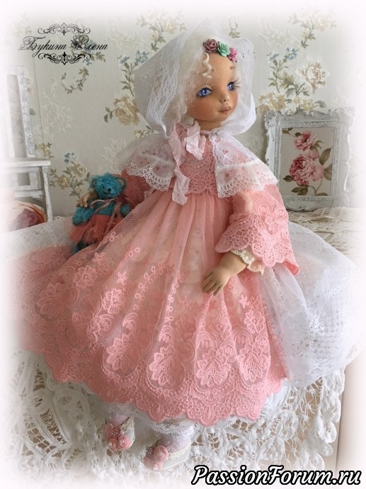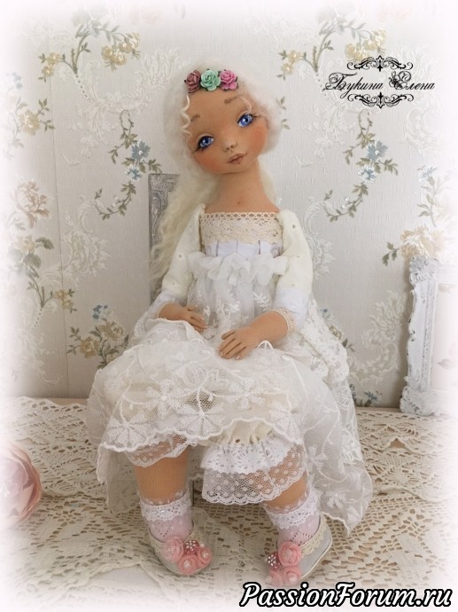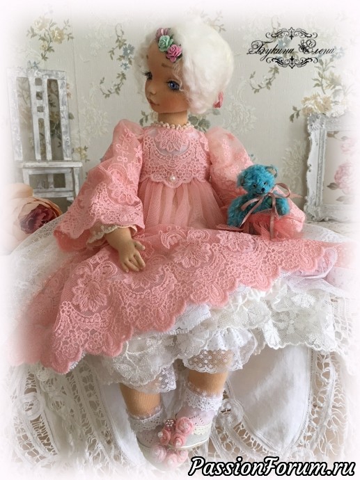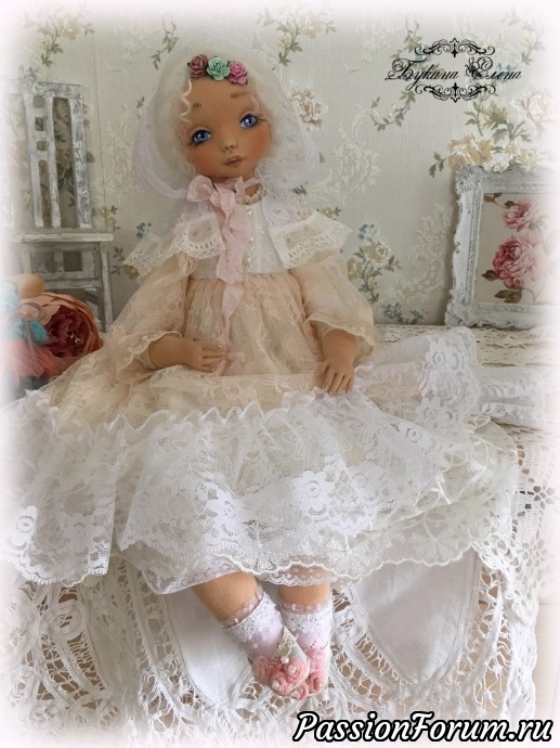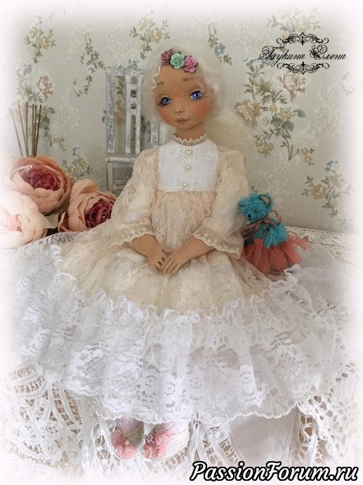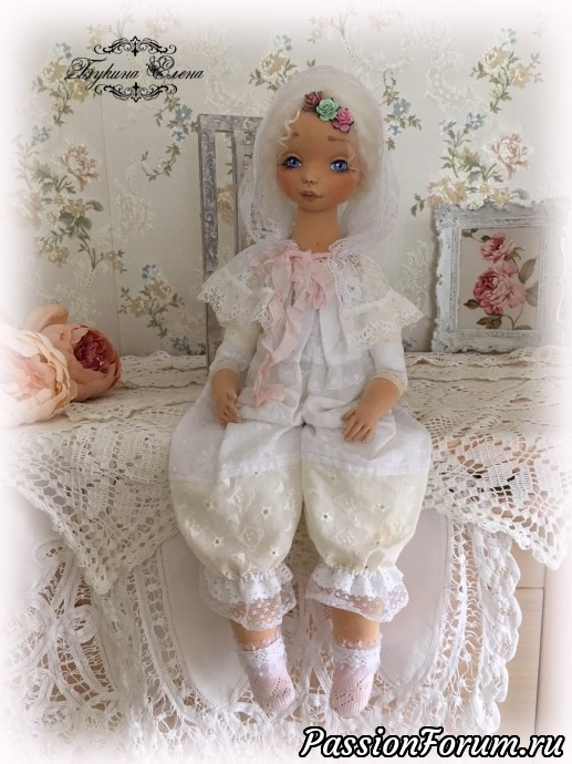 Вот такая послушная, милая и скромная девчушка появилась на свет. Оленька, коллекционная текстильная кукла. Малышка сшита из хлопка, обтянута трикотажем. Личико у куколки объёмное. Оля вся подвижная. Головушка крутится и наклоняется. Ручки и ножки крепятся, как у будуарных кукол или куклы-болтушки. Малышка стоять не хочет, зато она умеет красиво сидеть и мило складывать ручки. Пальчики на ручках гнутся, есть маникюр. Волосы натуральные овечьи кудри, можно аккуратно менять прическу. У малышки вся одежда съёмная, кроме комбинезона. Одежка сшита из хлопка, батиста, кружева и украшена бисером, шебби лентами. Ботиночки сшиты из натуральной итальянской замши. В руках у малышки любимая игрушка,мишка. Рост куколки 44 см.