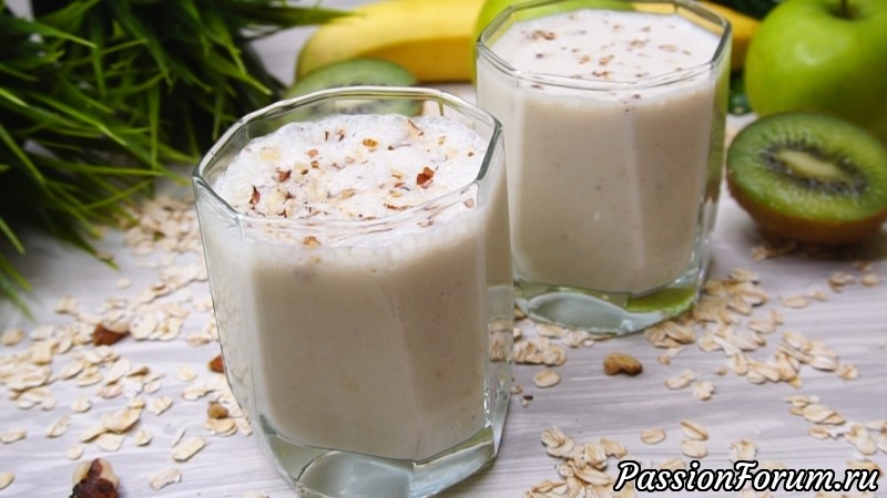 Смузи из молока банана и овсяных хлопьев. Полезный и освежающий, готовится очень быстро и просто.