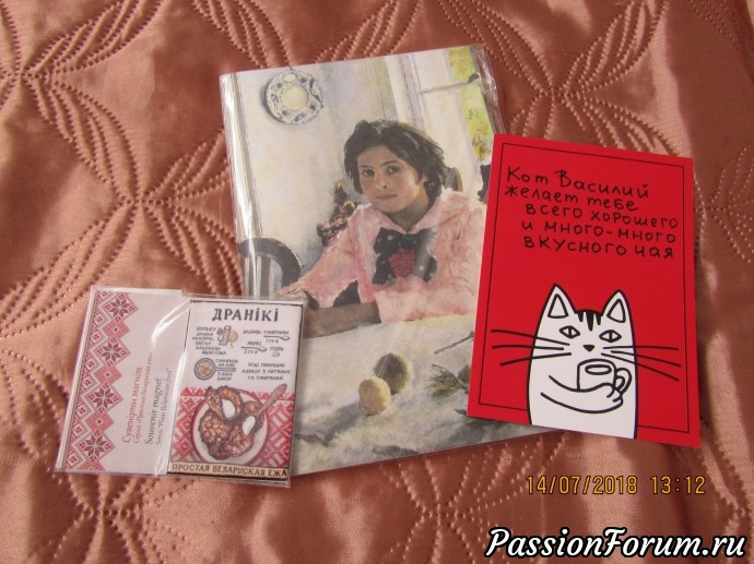 Блокнот, добрая открытка с теплыми словами и удивительный магнит с рецептом драников!Обязательно попробую сделать.Классный и очень необычный магнит!А полезный какой!