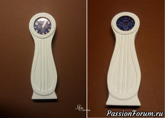 Далее фиксируем механизм часов. Я использовала фиксатор (внутреннюю пластиковую рамку) из самих часов, местами убрав лишнее. И клеить ничего не пришлось.