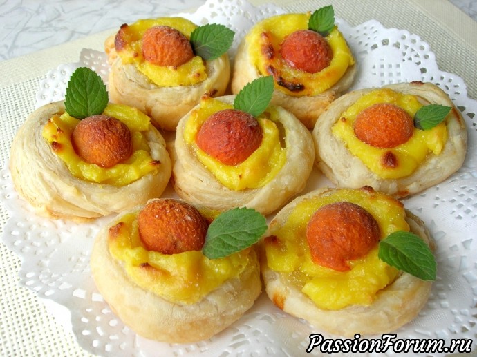 - 5.На тесто выкладываем заварной крем и кладем половинку абрикос.