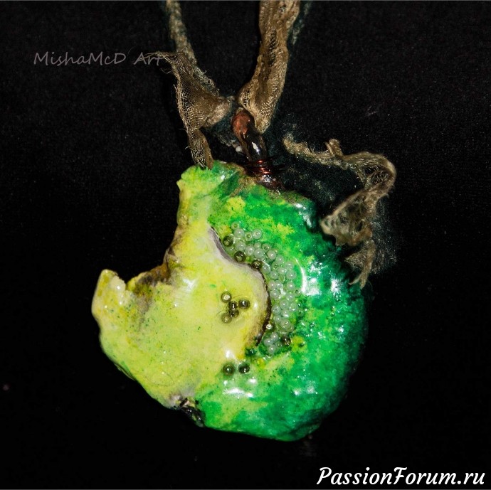 Я честно сказать не нашла, куда пихнуть мое творение, но, т.к. Листики и ,,ремешок,, колье валяные, решила в этот сектор разместить. Яблоко из полимерной глины. Декор бисер.