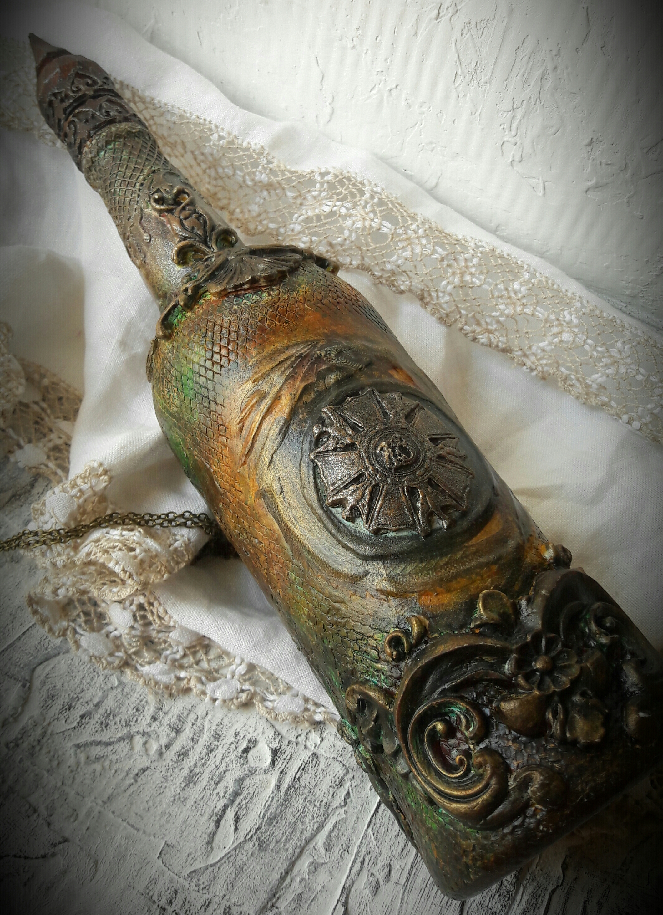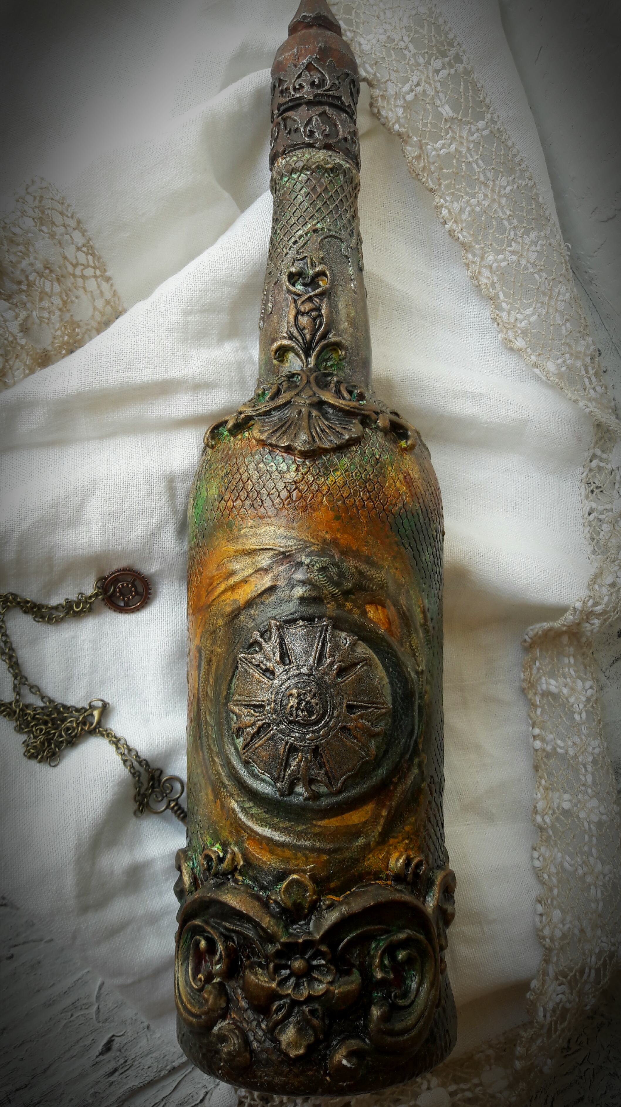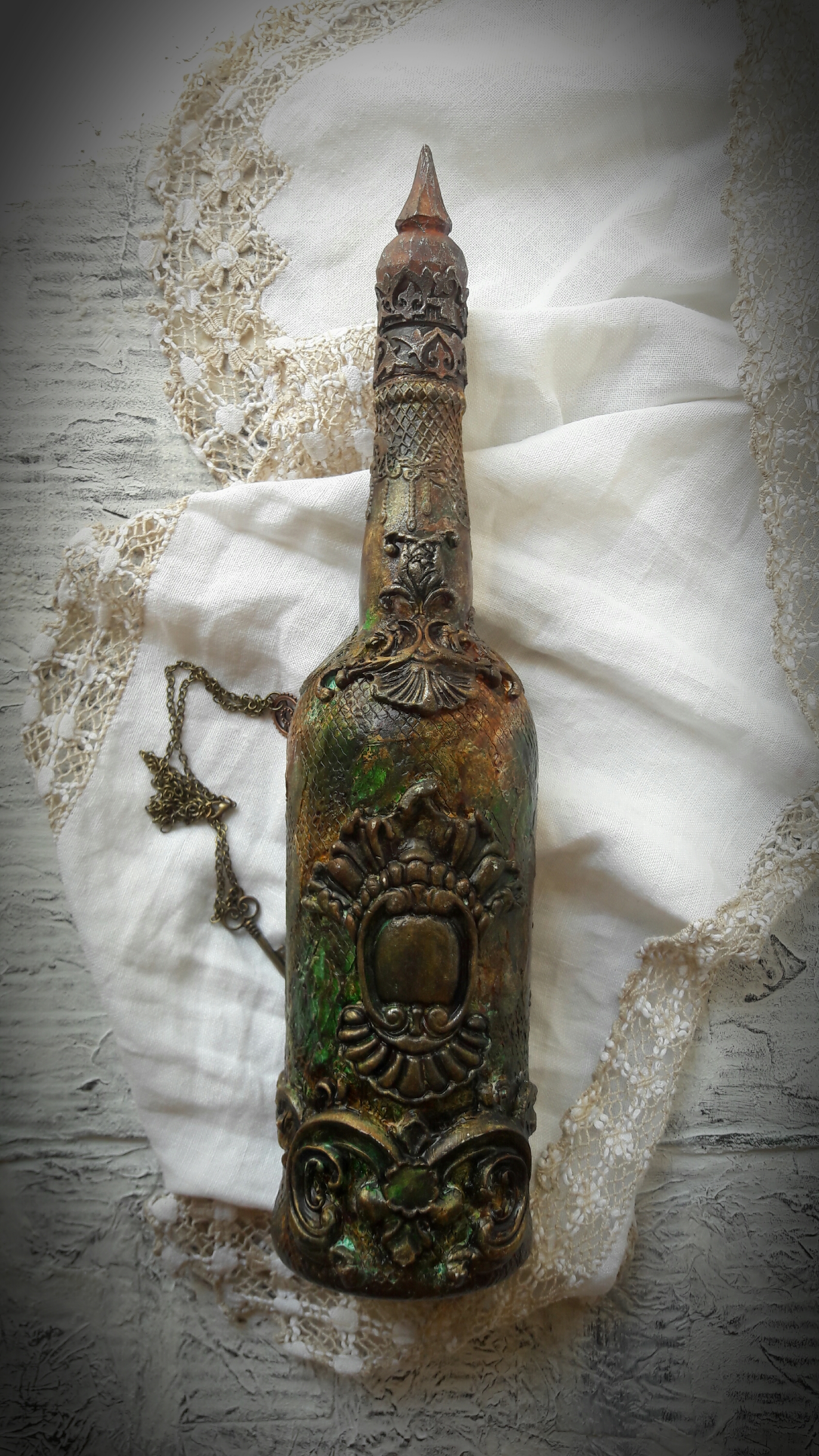 Как сказала одна моя знакомая : " эта бутылка подойдет для очень специфического алкоголя, уж больно она мрачная. Никогда не знаешь куда может завети нас наше воображение. Понравилась картинка, от нее и начала ,,плясать,, а получилось то что получилось)).