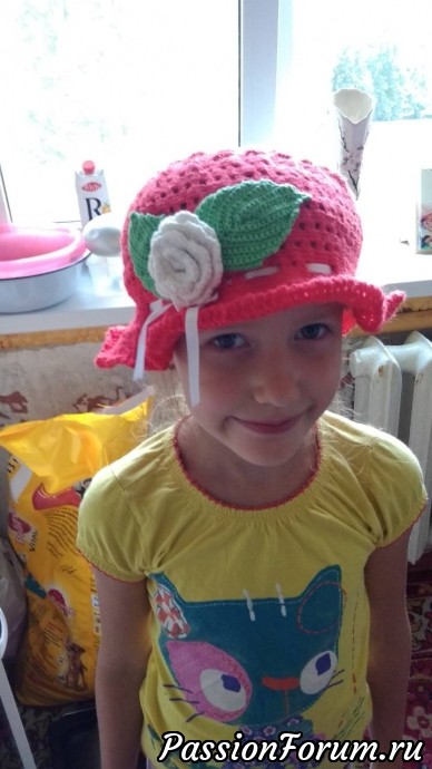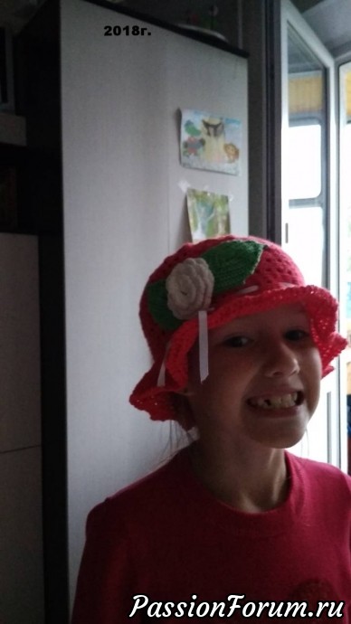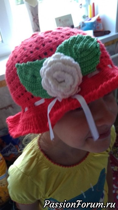 Прелестное создание Ваша внучка! А шляпку надо повернуть немного назад, чтобы ленточка не маячила перед глазками, ну, или приколоть её к полям. А что за ниточка? Мне показалось, что она немного толстовата для жары… или это на фото так смотрится? Но… уже осень на горизонте: девчушка будет носить шляпку до самых холодов! Даже с тёплыми кофточками, вспоминая о лете и заботливых бабушкиных ручках!