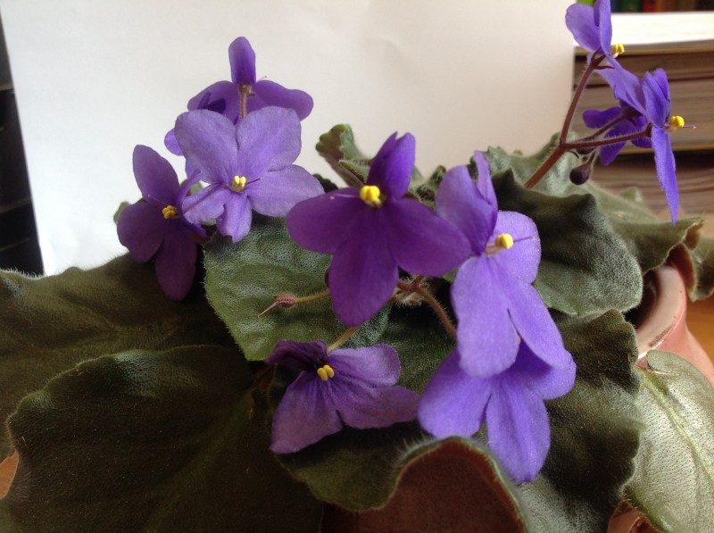 На работе фиалка цвете постоянно. Цветы самые простые, но очень милые, а листья какие мощные. Особого ухода не требует, только стоит не на подоконнике, а рядом.