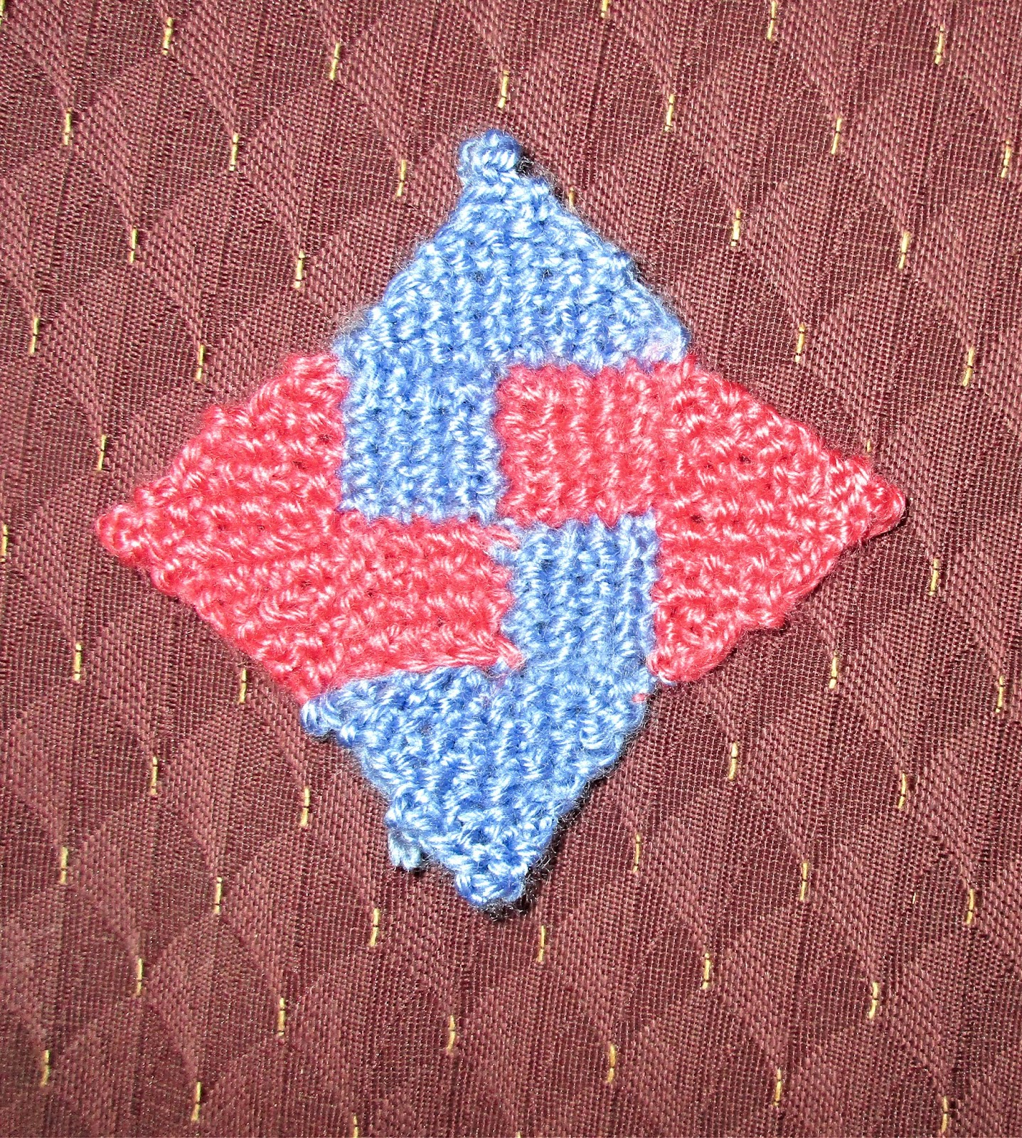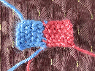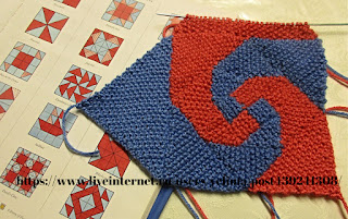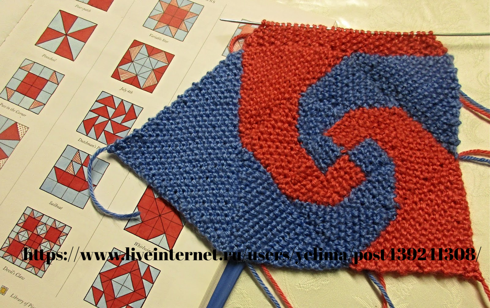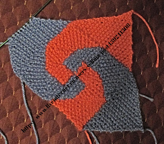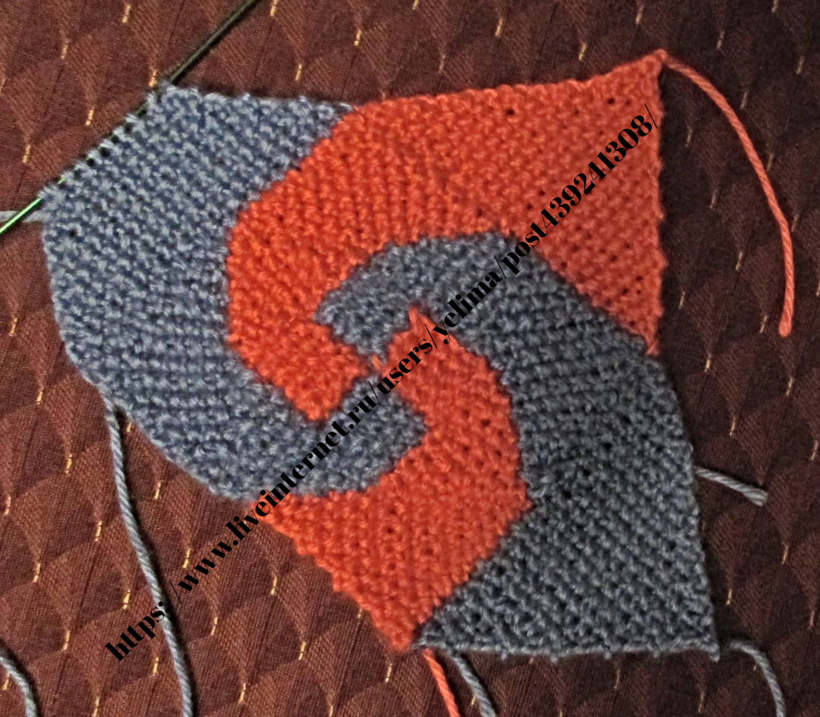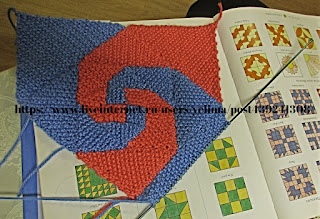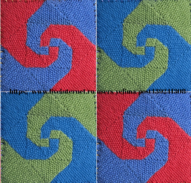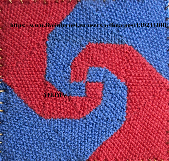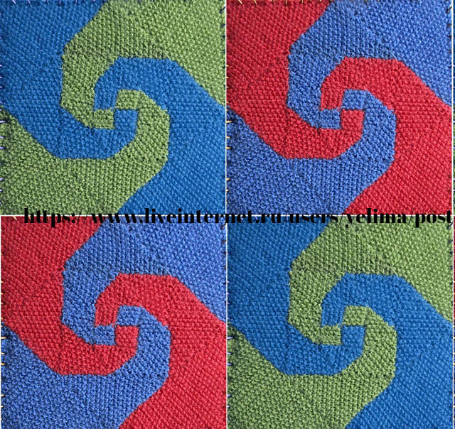 Третий и четвёртый квадратик я вязала вместе, способом интарсии, перекрещивая нити от двух разных клубков по изнанке.