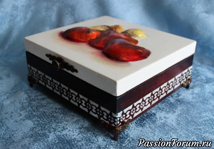 Ой, какое все вкусненькое, даже яблоками у меня запахло! Очень понравилась шкатулка с белой крышкой и яблоками наверху. Контрастно получилось, об’емно и… как-то неожиданно все,, глянцевость, сочность цвета при этом прозрачность какая-то. Очень понравилось!!!