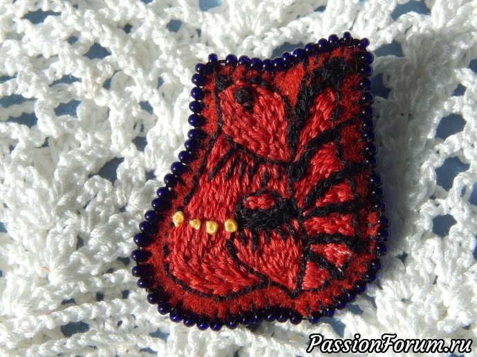 А техника простая - стежки "назад иголкой", "французкие узелки", петельный и тамбурные швы. Немножко иссиня-черного бисера для отделки края. Кусочек кожи для более длительной носки и металлическая основа для броши.