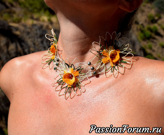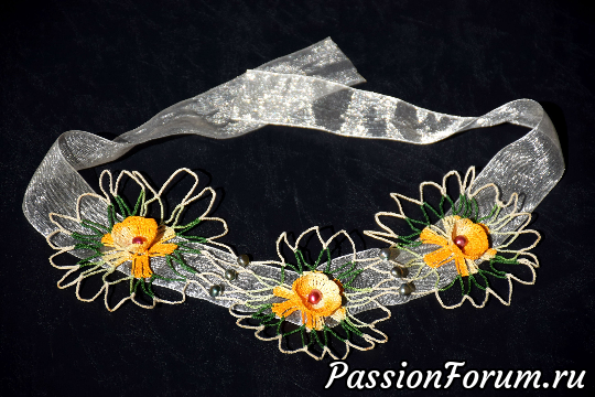 В основе колье вывязанные из хлопковых ниток цветы посаженные на органзовую ленту. Для украшения использовала речной жемчуг зеленого и красного цветов.