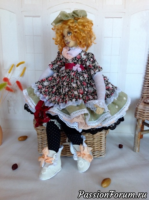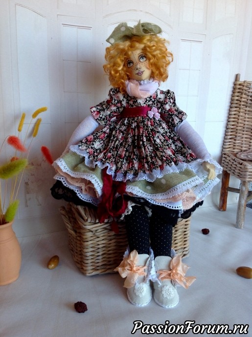 текстильная интерьерная куколка, 48 см. Частично на проволочном каркасе. Волосы - овечьи кудри, ботиночки - натуральная кожа.
