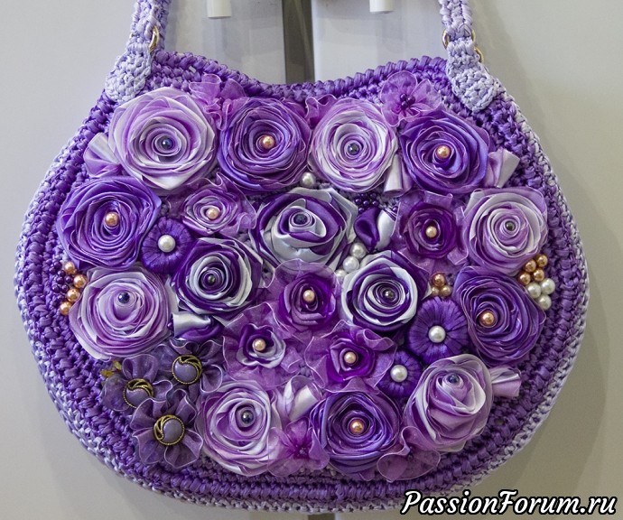 Новая работа!!!! Сумочка связанная из атласных лент, отделка цветами, бусинами, пуговицами. Размер сумки 39х30х8, достаточно большая и вместительная, внутри карман. Все элементы отделки выполнены с любовью и на совесть, элементы декора надежно пришиты мононитью . Сумку можно стирать в машине программа бережная стирка или руками.
